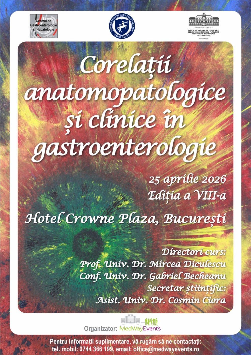Avem plăcerea să vă invităm să participați la cea de-a opta ediție a cursului „Corelații anatomopatologice și clinice în gastroenterologie”, un eveniment devenit deja o tradiție în peisajul medical românesc, coordonat științific de domnii Prof. Univ. Dr. Mircea Diculescu și Conf. Univ. Dr. Gabriel Becheanu.