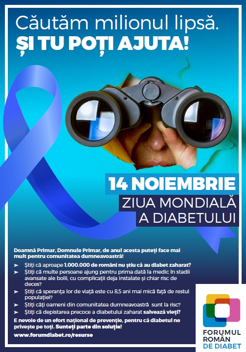 Cu ocazia Zilei Mondiale a Diabetului, Forumul Român de Diabet atrage atenția asupra prevalenței crescute afecțiunii în țara noastră, precum și a numărului de persoane care nu știu că trăiesc cu diabet zaharat. Aproape 1 milion de persoane nu sunt diagnosticate, o parte semnificativă dintre aceștia ajungând la medic în stadii avansate ale bolii, cu complicații deja instalate.