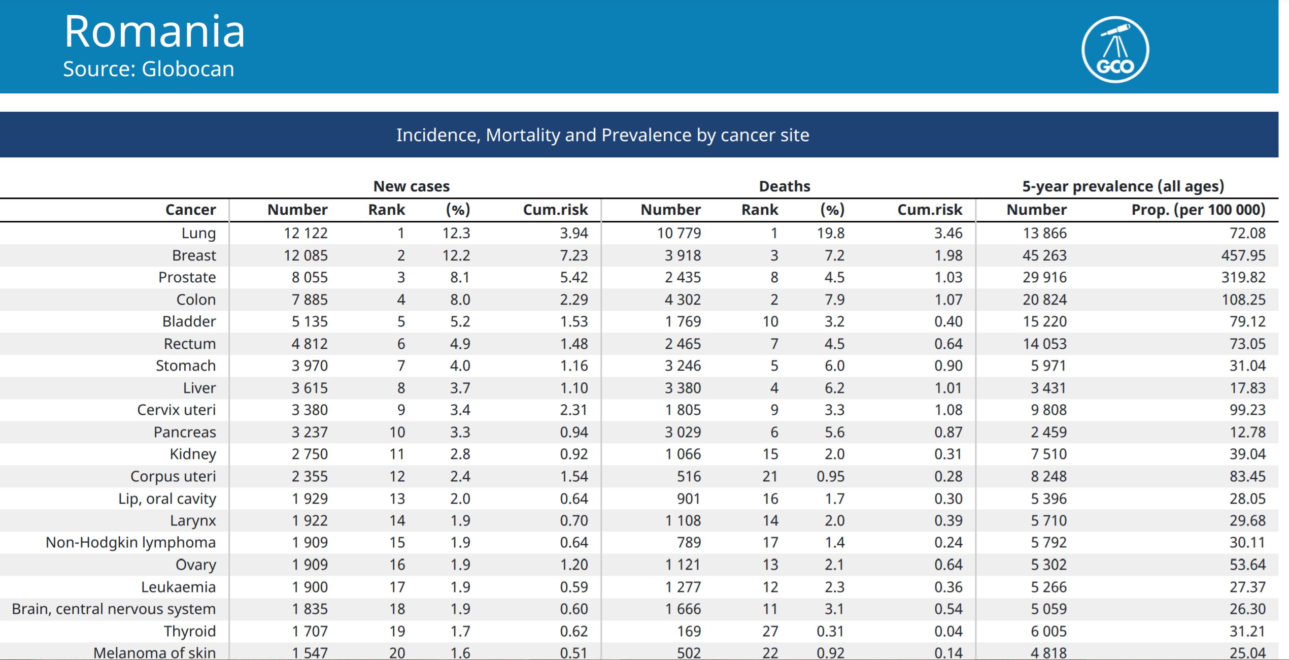 Dintre toate cancerele de pe Pământ se moare de cancer pulmonar cel mai mult și cel mai repede. În România, cancerul pulmonar rămâne cea mai întâlnită formă de cancer, circa 12.000 de cazuri noi/an, dar din păcate și cu cea mai mare mortalitate, înregistrându-se 10.779 decese (*Globocan 2020)