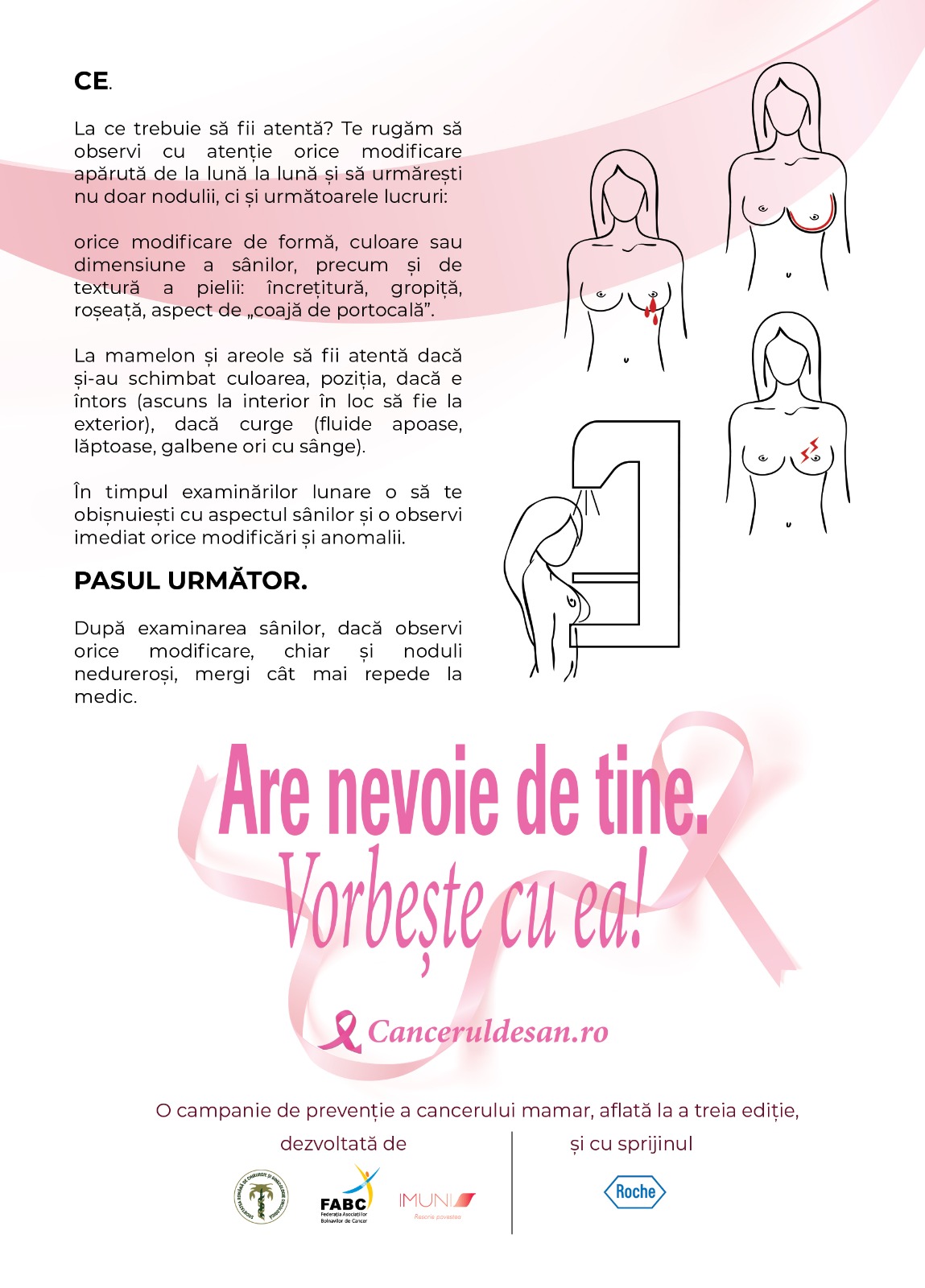 „Are nevoie de tine. Vorbește cu ea” este o campanie de prevenție a cancerului mamar, aflată la a treia ediție, dezvoltată de Societatea Română de Chirurgie și Ginecologie Oncologică (SRCGO), Federația Asociațiilor Bolnavilor de Cancer din România (FABC), Asociația Imunis și sprijinită de Roche.