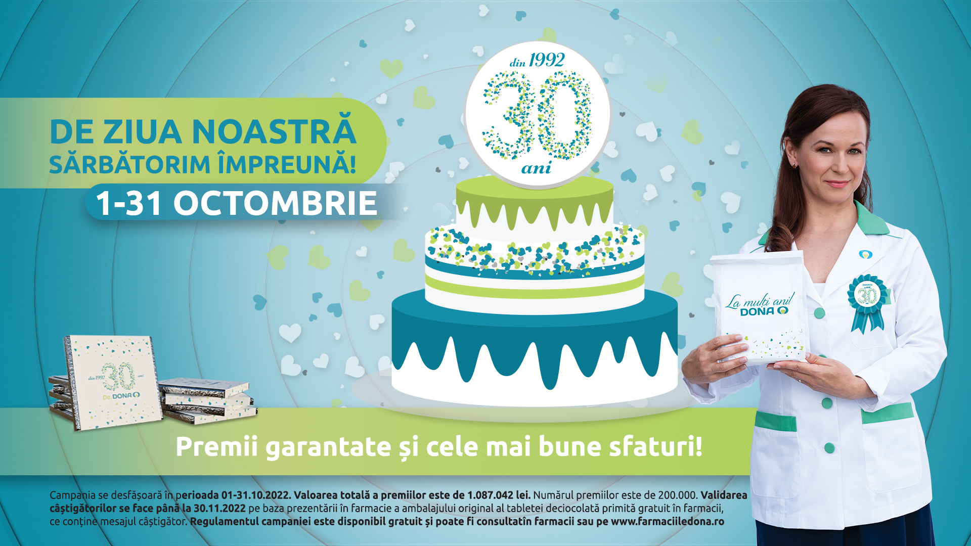 La împlinirea celor 30 de ani de activitate, Farmaciile DONA doresc să răsplătească încrederea pacienților care aleg DONA în căutarea celor mai bune sfaturi pentru sănătate și îi invită, în luna octombrie, să sărbătorească împreună, cu peste 2 milioane de premii surpriză garantate. Regulamentul campaniei poate fi consultat în farmacii sau pe www.farmaciiledona.ro.