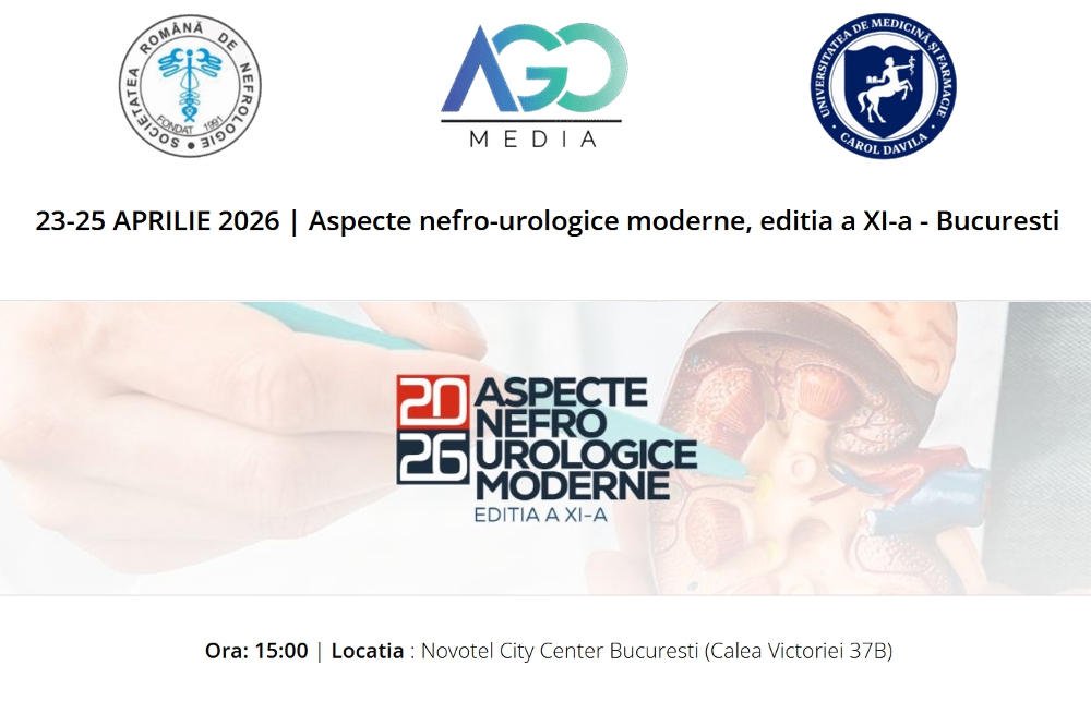 Afisari: 99AGOMedia va invita sa participati la Conferinta Nationala “Aspecte nefro-urologice moderne”, editia a XI,-a ce va avea loc in perioada 23-25 aprilie 2026, la Hotel Novotel Bucuresti, sala Paris