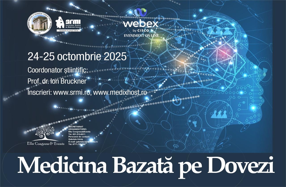 Societatea Română de Medicină Internă organizează tradiționala conferință "Medicina Bazată pe Dovezi", ce se va desfășura online prin platforma CISCO Webex și Youtube,, în perioada 24 octombrie- 25 octombrie 2025